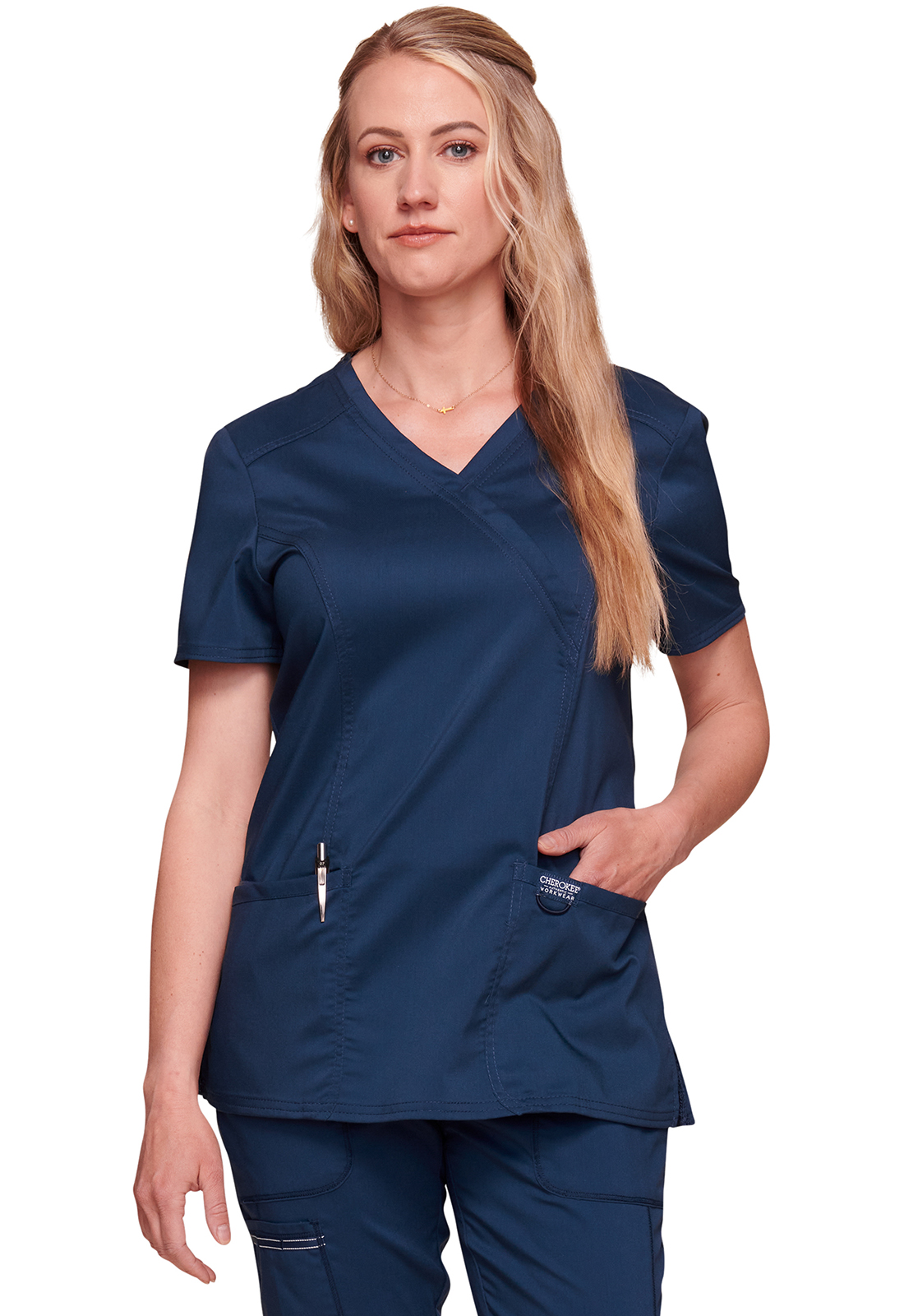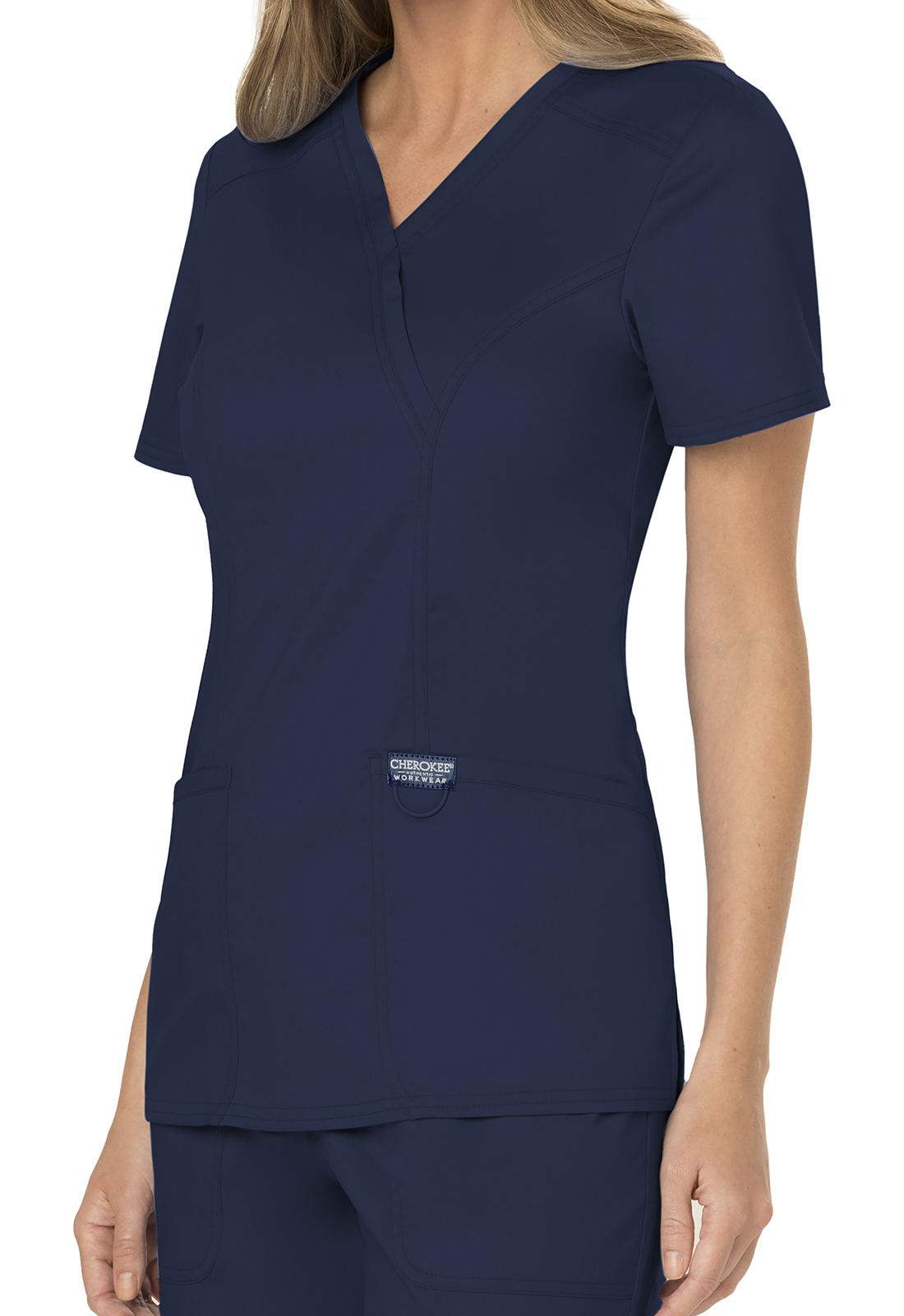 Ανανεώστε την επαγγελματική σας εμφάνιση με την άνετη και κομψή γυναικεία ιατρική μπλούζα Revolution by Cherokee Workwear Mock Wrap. Σχεδιασμένη με γνώμονα την άνεση και τη λειτουργικότητα, αυτή η μπλούζα διαθέτει λαιμόκοψη "crossover mock wrap" και κολακευτικές πένσες μπροστά και πίσω που προσφέρουν μια σύγχρονη και θηλυκή σιλουέτα. Η απουσία ετικέτας στο λαιμό ("tagless neckline") εξασφαλίζει άνεση όλη μέρα, ενώ η θηλιά με ελαστικό κορδόνι για το σήμα ή τα κλειδιά προσθέτει πρακτικότητα.
