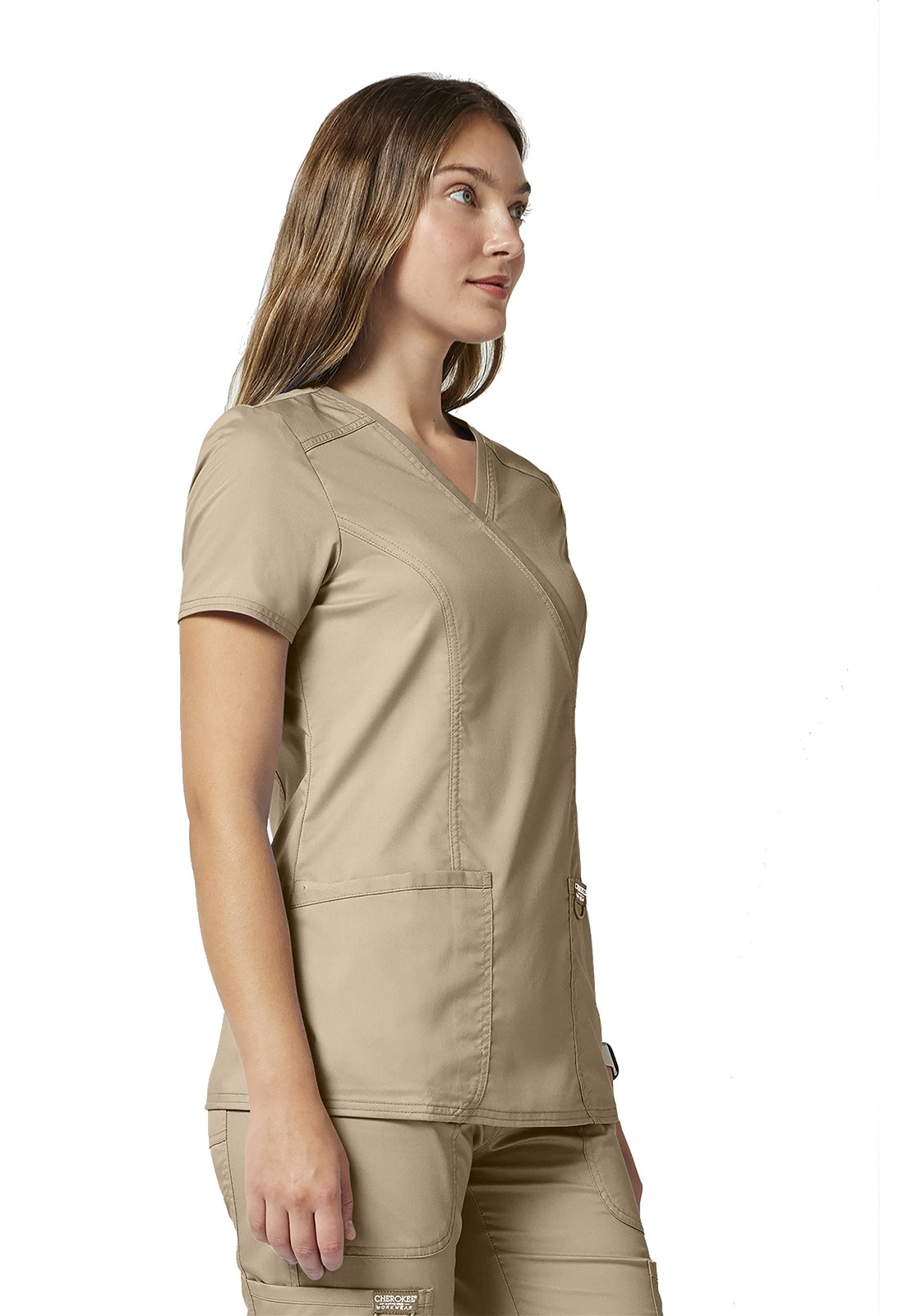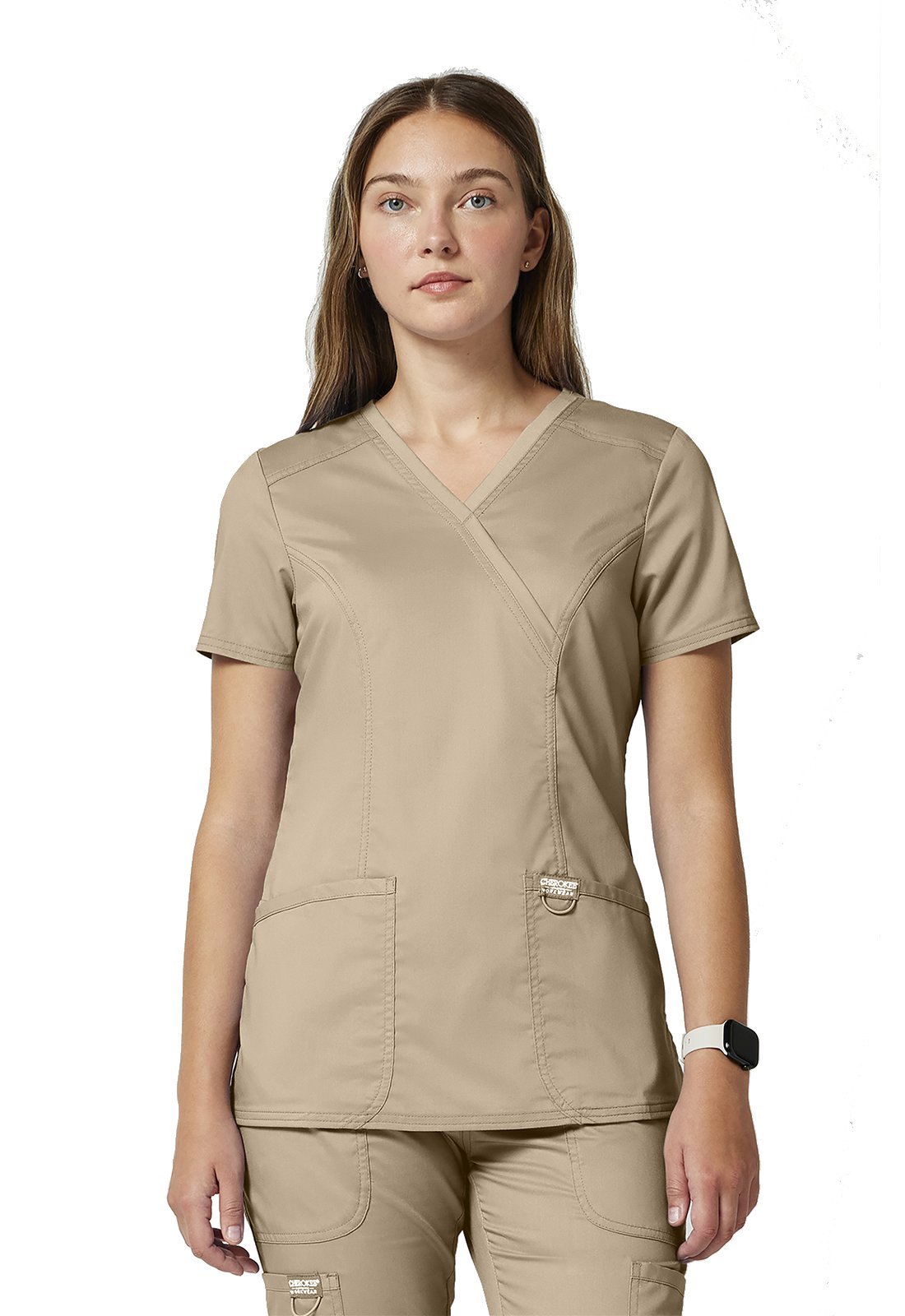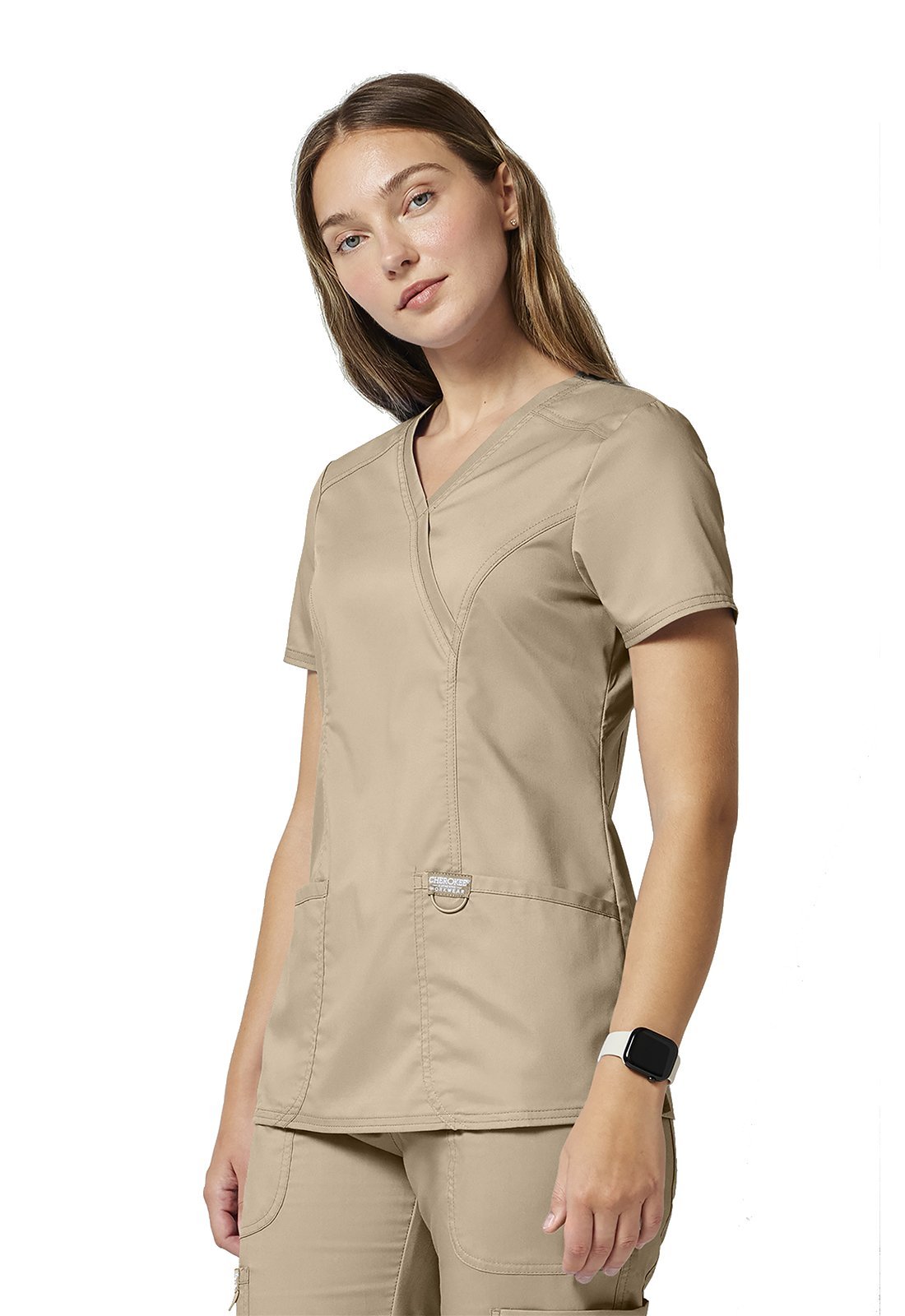 Ανανεώστε την επαγγελματική σας εμφάνιση με την άνετη και κομψή γυναικεία ιατρική μπλούζα Revolution by Cherokee Workwear Mock Wrap. Σχεδιασμένη με γνώμονα την άνεση και τη λειτουργικότητα, αυτή η μπλούζα διαθέτει λαιμόκοψη "crossover mock wrap" και κολακευτικές πένσες μπροστά και πίσω που προσφέρουν μια σύγχρονη και θηλυκή σιλουέτα. Η απουσία ετικέτας στο λαιμό ("tagless neckline") εξασφαλίζει άνεση όλη μέρα, ενώ η θηλιά με ελαστικό κορδόνι για το σήμα ή τα κλειδιά προσθέτει πρακτικότητα.