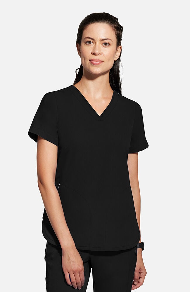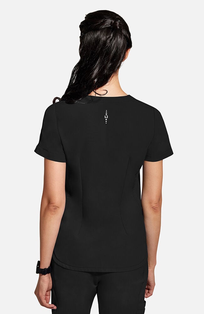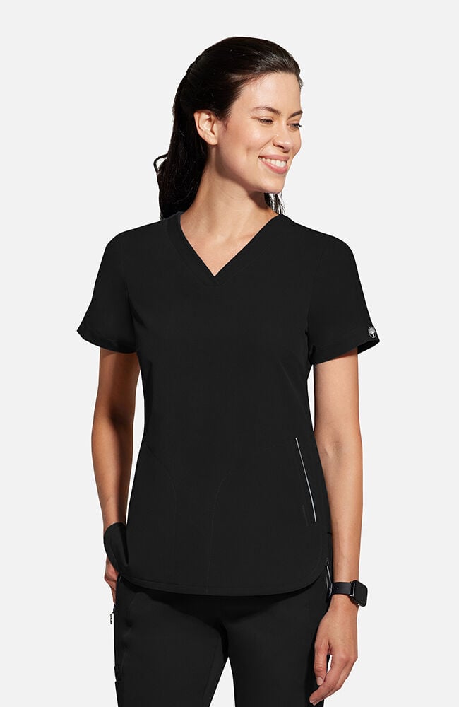 Διαθέτει μια κομψή και διακριτική λαιμόκοψη σε σχήμα V που προσδίδει θηλυκότητα και επαγγελματισμό, επιτρέποντας παράλληλα την άνετη κίνηση κατά τη διάρκεια της εργασίας. Οι ανακλαστικές λεπτομέρειες στις τσέπες προσθέτουν μια μοντέρνα, σπορ πινελιά, ενώ παράλληλα αυξάνουν τη λειτουργικότητα του ενδύματος σε χώρους με ιδιαίτερο φωτισμό. Περιλαμβάνει δύο πλάγιες, κομψές τσέπες οι οποίες είναι τοποθετημένες σε ιδανική γωνία για εύκολη πρόσβαση στα απαραίτητα ιατρικά εργαλεία ή το κινητό σας τηλέφωνο. Το στρογγυλεμένο τελείωμα στο κάτω μέρος και τα πλευρικά ανοίγματα εξασφαλίζουν ότι η μπλούζα παραμένει στη θέση της, προσφέροντας ταυτόχρονα πλήρη ελευθερία κινήσεων.