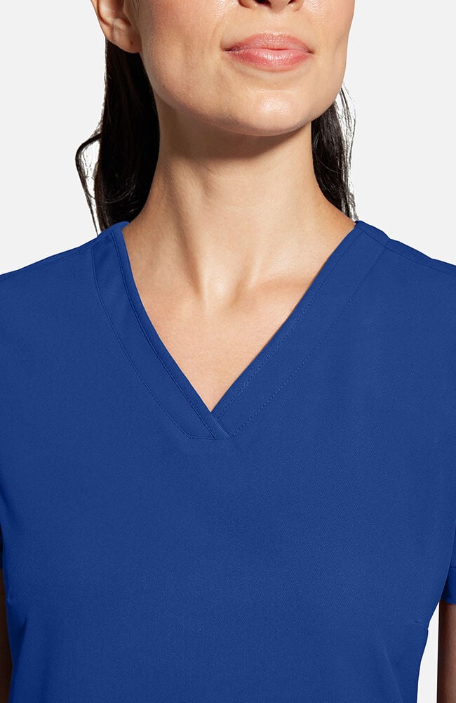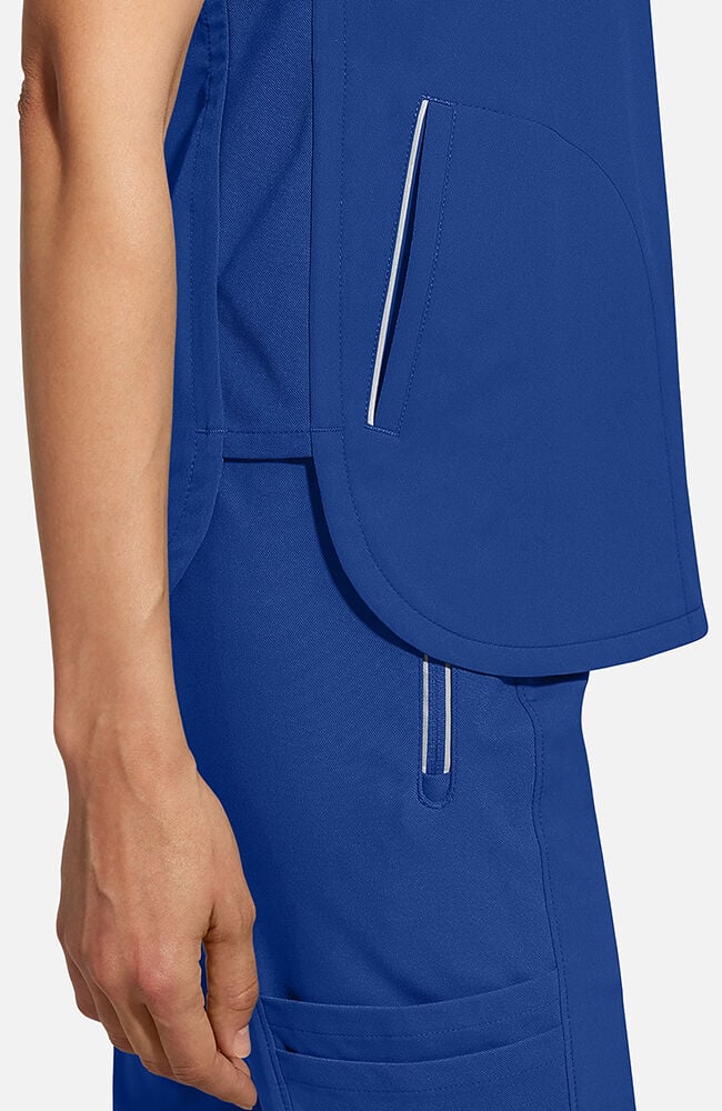 Διαθέτει μια κομψή και διακριτική λαιμόκοψη σε σχήμα V που προσδίδει θηλυκότητα και επαγγελματισμό, επιτρέποντας παράλληλα την άνετη κίνηση κατά τη διάρκεια της εργασίας. Οι ανακλαστικές λεπτομέρειες στις τσέπες προσθέτουν μια μοντέρνα, σπορ πινελιά, ενώ παράλληλα αυξάνουν τη λειτουργικότητα του ενδύματος σε χώρους με ιδιαίτερο φωτισμό. Περιλαμβάνει δύο πλάγιες, κομψές τσέπες οι οποίες είναι τοποθετημένες σε ιδανική γωνία για εύκολη πρόσβαση στα απαραίτητα ιατρικά εργαλεία ή το κινητό σας τηλέφωνο. Το στρογγυλεμένο τελείωμα στο κάτω μέρος και τα πλευρικά ανοίγματα εξασφαλίζουν ότι η μπλούζα παραμένει στη θέση της, προσφέροντας ταυτόχρονα πλήρη ελευθερία κινήσεων.