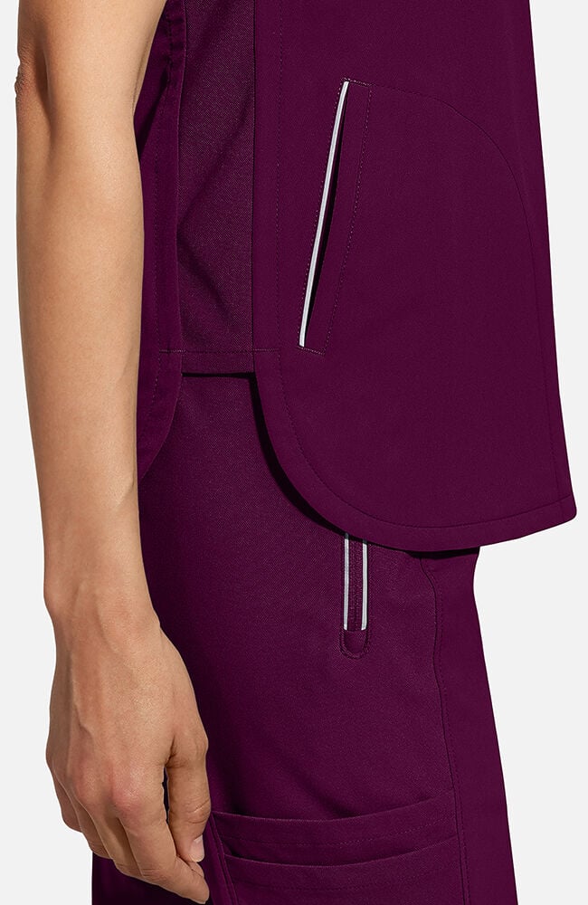 Διαθέτει μια κομψή και διακριτική λαιμόκοψη σε σχήμα V που προσδίδει θηλυκότητα και επαγγελματισμό, επιτρέποντας παράλληλα την άνετη κίνηση κατά τη διάρκεια της εργασίας. Οι ανακλαστικές λεπτομέρειες στις τσέπες προσθέτουν μια μοντέρνα, σπορ πινελιά, ενώ παράλληλα αυξάνουν τη λειτουργικότητα του ενδύματος σε χώρους με ιδιαίτερο φωτισμό. Περιλαμβάνει δύο πλάγιες, κομψές τσέπες οι οποίες είναι τοποθετημένες σε ιδανική γωνία για εύκολη πρόσβαση στα απαραίτητα ιατρικά εργαλεία ή το κινητό σας τηλέφωνο. Το στρογγυλεμένο τελείωμα στο κάτω μέρος και τα πλευρικά ανοίγματα εξασφαλίζουν ότι η μπλούζα παραμένει στη θέση της, προσφέροντας ταυτόχρονα πλήρη ελευθερία κινήσεων.