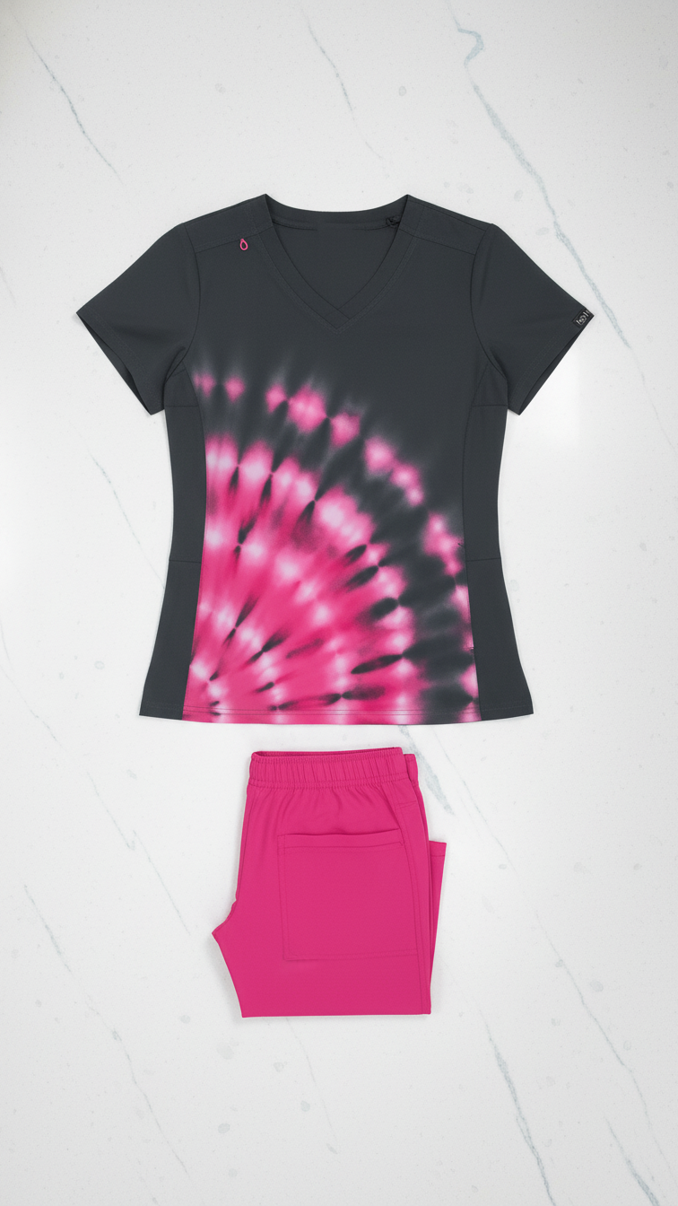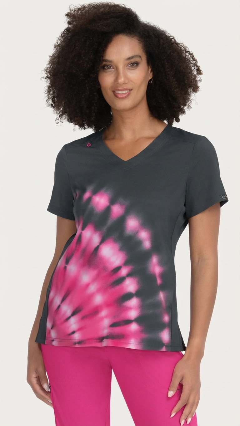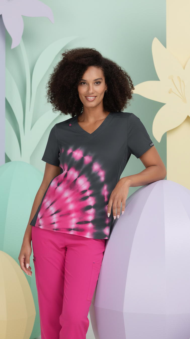 Η επιλογή της σειράς KOI™ Basics αποτελεί μια επένδυση στην επαγγελματική σας εικόνα. Η μπλούζα Tie Dye Burst Flamingo ξεχωρίζει για το μοναδικό της τύπωμα —ένα "εκρηκτικό" μοτίβο φλαμίνγκο σε charcoal φόντο— που προσδίδει μια νότα αισιοδοξίας στον εργασιακό χώρο. Παράλληλα, οι κοντράστ διπλές ραφές ενισχύουν τη δομή του ενδύματος, προσφέροντας εξαιρετική αντοχή στις συχνές πλύσεις.