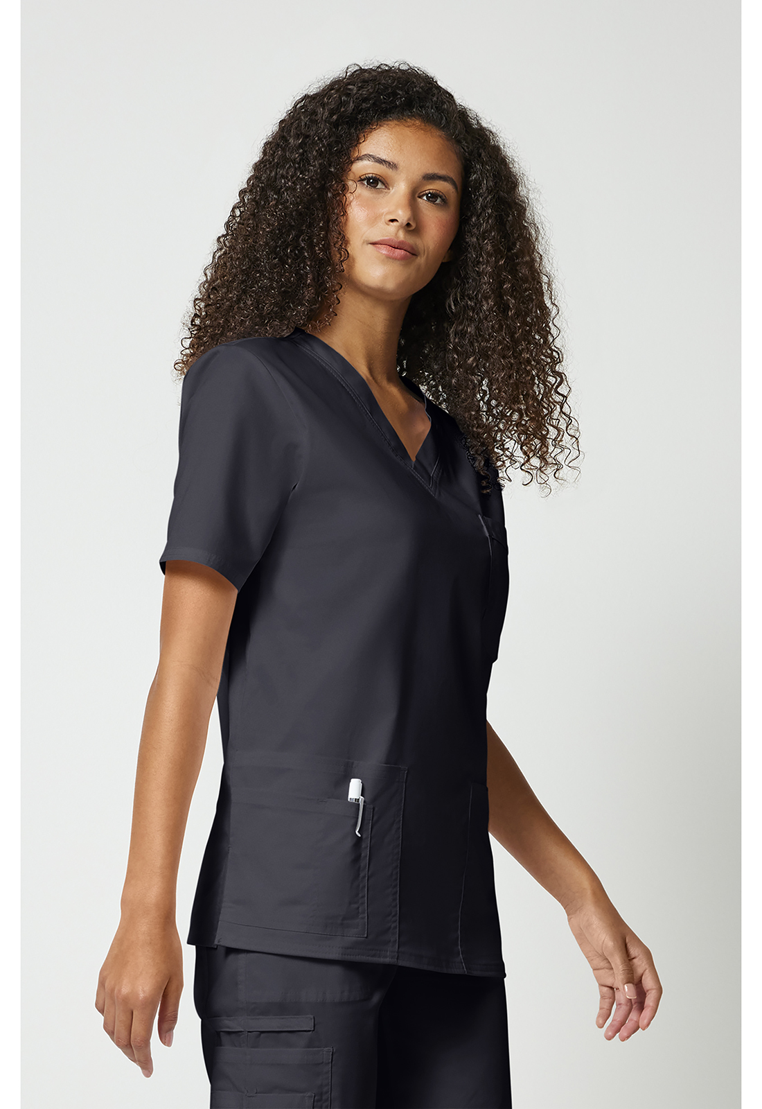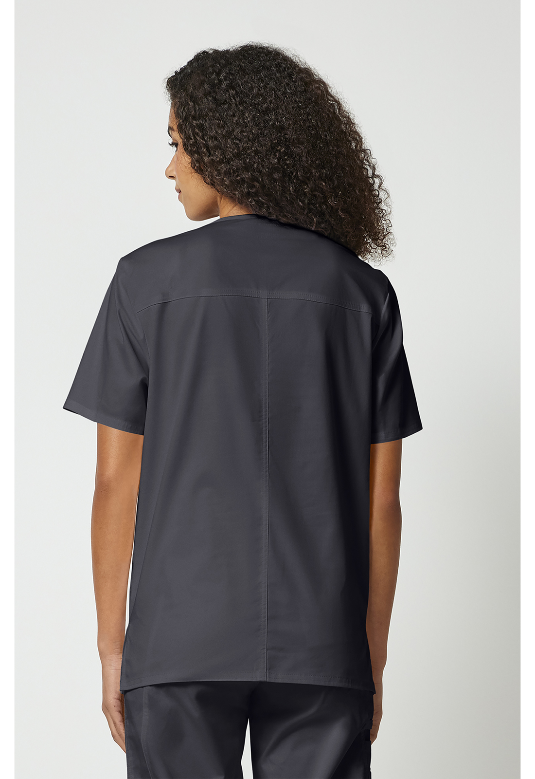 Η λειτουργικότητα βρίσκεται στον πυρήνα του σχεδιασμού της μπλούζας. Διαθέτει συνολικά τέσσερις στρατηγικά τοποθετημένες τσέπες, επιτρέποντας την άμεση πρόσβαση σε απαραίτητα εργαλεία και προσωπικές συσκευές. Η τσέπη στο στήθος είναι εξοπλισμένη με ειδική υποδοχή για ιατρικά εργαλεία, ενώ η επιπλέον τσέπη στη δεξιά πλευρά προσφέρει ασφαλή χώρο για κινητό τηλέφωνο ή αξεσουάρ. Τα πλευρικά ανοίγματα και ο σχεδιασμός "back yoke" στην πλάτη ενισχύουν τον αερισμό και την άνεση, καθιστώντας την μπλούζα κατάλληλη για καθημερινή χρήση σε κάθε κλινικό πλαίσιο.